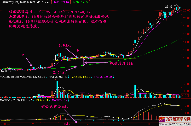 在(图70-1)中,我们在b垂直线处得到5日、10日绞合处的均价为9.95元,60日均线为8.04元,那么【跑道厚度】等于(9.95-8.04)除以9.95元等于19%。这是一个相对数,在一般情况下,这个数值越大,说明主力买进该股时的追涨决心越大,也意味着未来该股的上升空间越大。