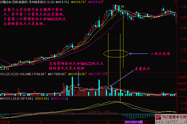 由于主力停止向上收集筹码,成交量开始萎缩,于是出现成交量的死亡交叉。而此时价死叉或MACD死叉并未形成,也就是它们不支持三死叉见顶的结论。