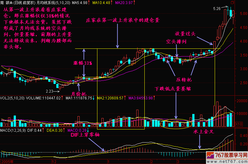 第48节:三死叉头背离图形特征:见(图48-1)所示。图中a点所指是第一个5日均价线死叉10日均价线的点。图中b点所指是第二个5日均价线死叉10日均价线的点。观察发现b点的死亡交叉位置比a点的死亡交叉位置要高;图中c点所指是第一个5日均量线死叉10日均量线的点。图中d点所指是第二个5日均量线死叉10日均量线的点。观察发现d点的死亡交叉位置比c点的死亡交叉位置要低;图中e点所指是第一个MACD指标的死亡交叉点。图中f点所指是第二个MACD指标的死亡交叉点。观察发现f点的死亡交叉位置比e点的死亡交叉位置要低。这就构成了三死叉见顶的图形,价死叉位置抬高,而量死叉、MACD死叉位置降低。图48-1图48-2[NextPage]图48-3图48-4[NextPage]图48-5小结:三死叉头背离是可靠的判头技术,如果在股价长期上涨后庄家获利丰厚,那么此时出现三死叉头背离的走势意味着头部的成立,下跌是今后一段时间的主基调。