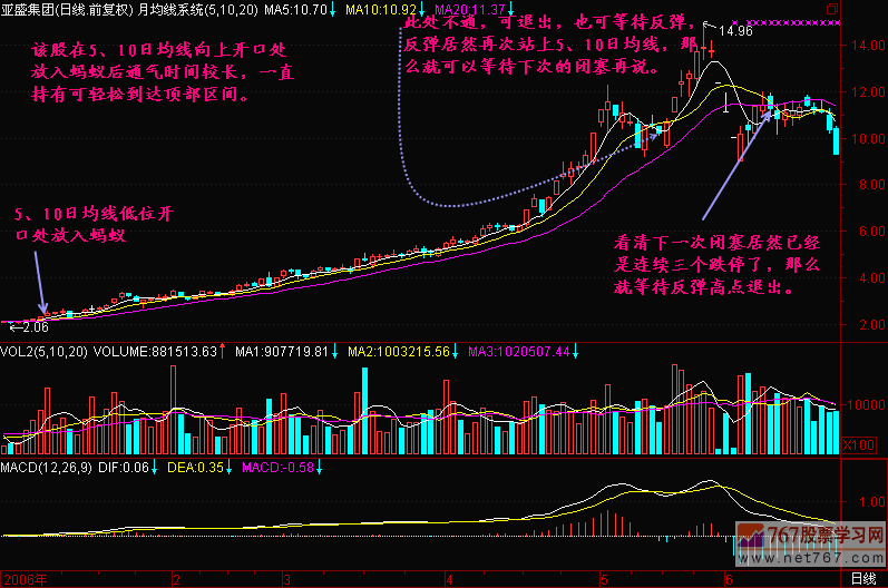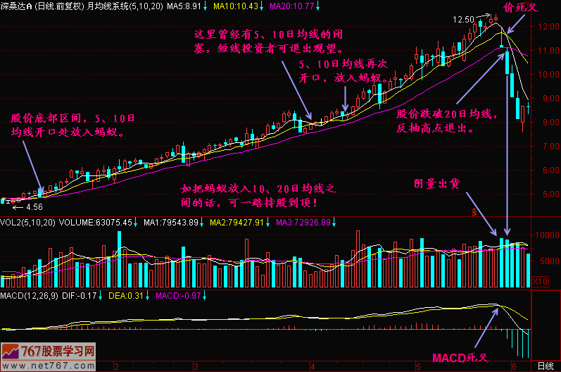 以后发现股价上升时尽管有波动,但总体上浮在5日、10日和20日均线上运行,走势强的个股在上升过程中连5日均线都不碰。中等强势股虽有盘中破5日均线,但收盘价仍能浮在5日均线之上。一般股票有时破5日均线和10日均线,但在5日均线和10日均线不死亡交叉前仍能维持股价安全。由此我想出一个办法,想象捉一只蚂蚁放在5日均线和10日均线之间爬行,只要蚂蚁还能往上爬就持股不动。对于中线投资者来说可把蚂蚁放在10日均线和20日均线之间爬行,这样显得更稳定。