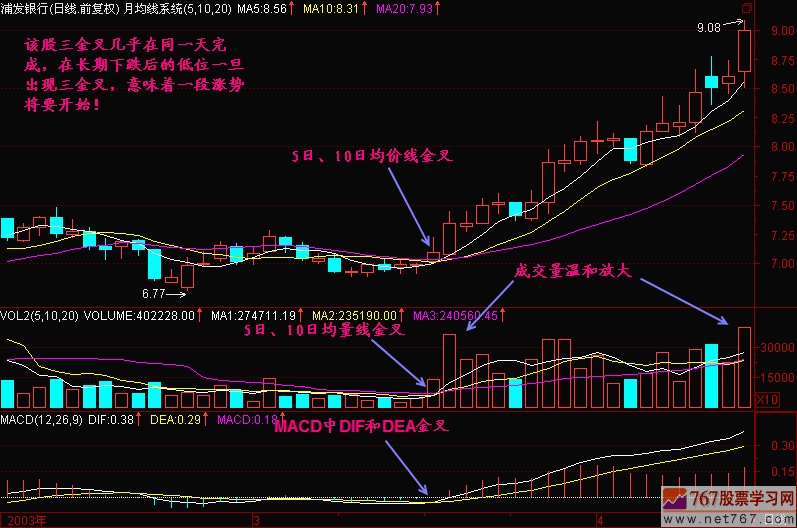(3)当成交量继续放大推动股价上行时,5日、10日价均线、量均线和MACD自然发生黄金交叉。