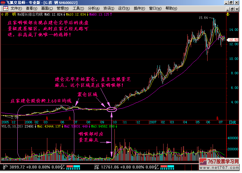 第40节:潜收集,强收集,拉高图形特征:(1)股价在长期下跌过程中会缓慢见底启稳,庄家会在下跌末期开始悄悄地收集筹码,这就是潜收集。由于这一时期成交量极小