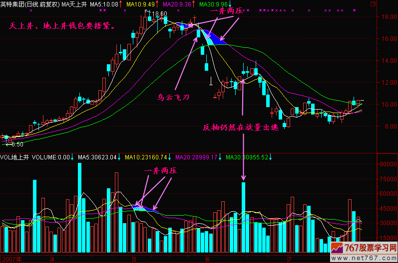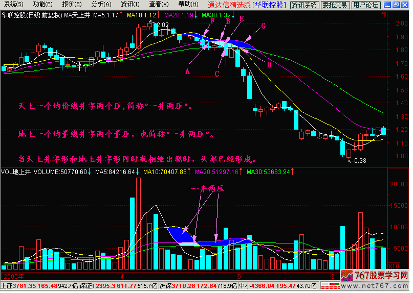 成交量均量线同理,也由四个死亡交叉点组成一个井字形,这个井字形称为“地上井”,伴随地上井同时出现的也有两个量压。这个组合也成为“一井两压”。